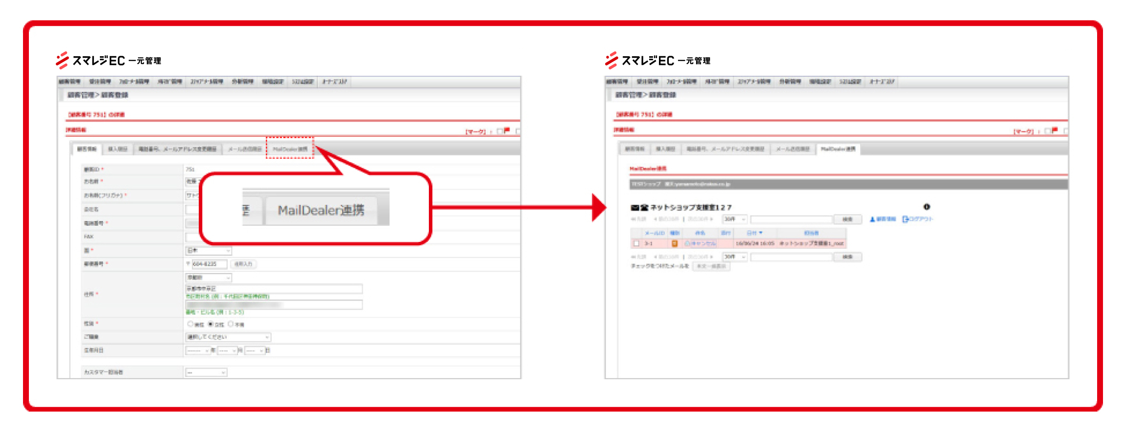 「スマレジEC・一元管理」は、メール共有・メール管理システムの「メールディーラー」との連携が可能。 「メールディーラー」でお客様からのメールを受信・確認すると、1クリックで「スマレジEC・一元管理」受注管理画面へ。 すぐに受注が確認できるから、お客様へのメール対応がより簡単に、よりスムーズにできます。