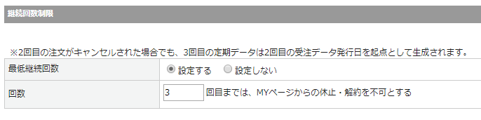 【最低継続回数】とは商品の良さをご体感頂くために、最低何回はご注文を続けていただくというような設計が可能となり、本設定を行うとお客様MYページからのご解約は対象の回数以降のみから可能となります。