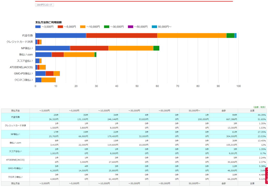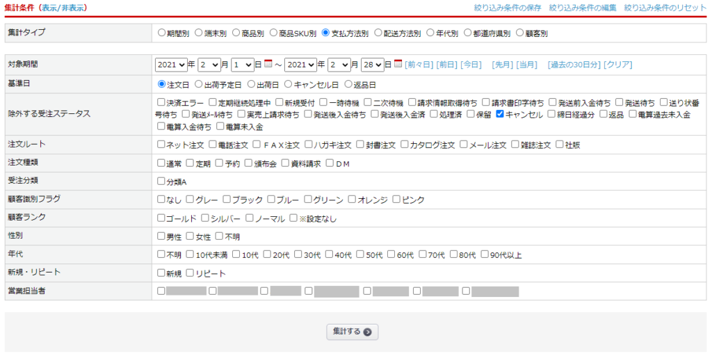 「集計タイプ」について[支払方法別]を選択し、他集計条件を設定します。下部にある【集計する】ボタンをクリックすると集計条件に合致する受注データの集計を行い、集計結果が表示されます。