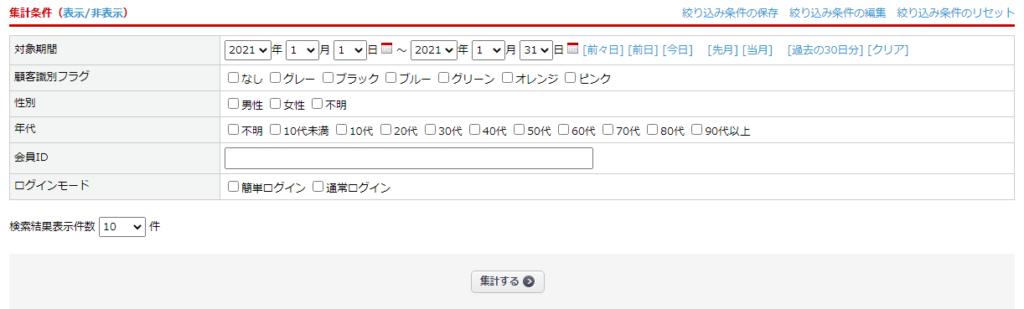 顧客識別フラグ システム設定>マスターデータ管理 の「顧客管理:顧客識別フラグ」 で登録のある各顧客識別フラグのうち、集計対象とするものを選択(複数選択可)
