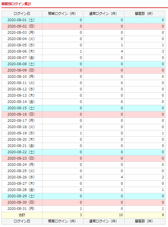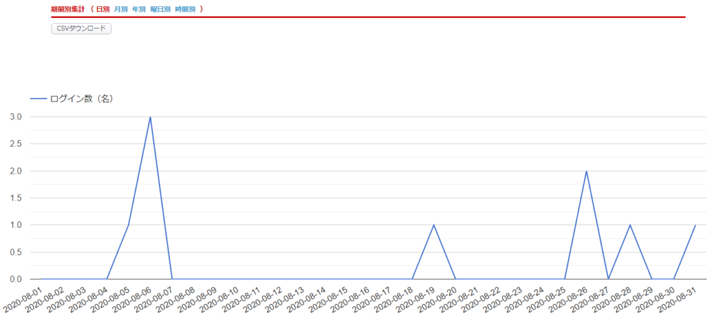 [期間別集計]で(日別 月別 年別 曜日別 時間別)をクリックすると、クリックした期間別に表示切り替えが可能です。