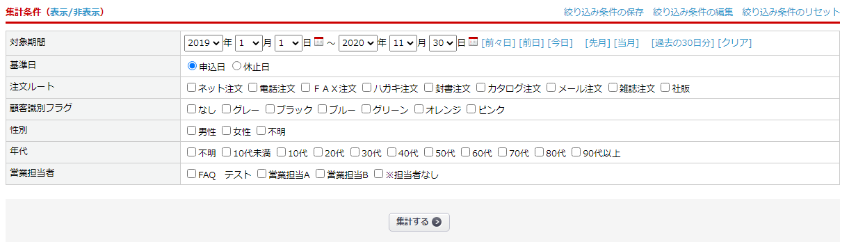 | 顧客識別フラグ | システム設定>マスターデータ管理 の「顧客管理:顧客識別フラグ」 で登録のある各顧客識別フラグのうち、集計対象とするものを選択(複数選択可) ※選択のない場合は全項目が集計対象となります。 |