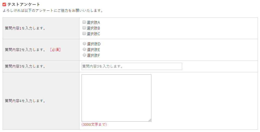 | アンケート回答必須選択* | 回答を[任意]とするか[必須]とするか選択 |