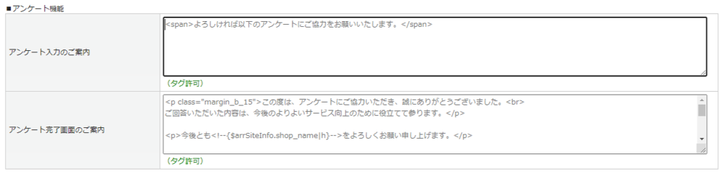 「アンケート機能」項目の「アンケート入力のご案内」 、「 アンケート完了画面のご案内」の編集が可能です。
