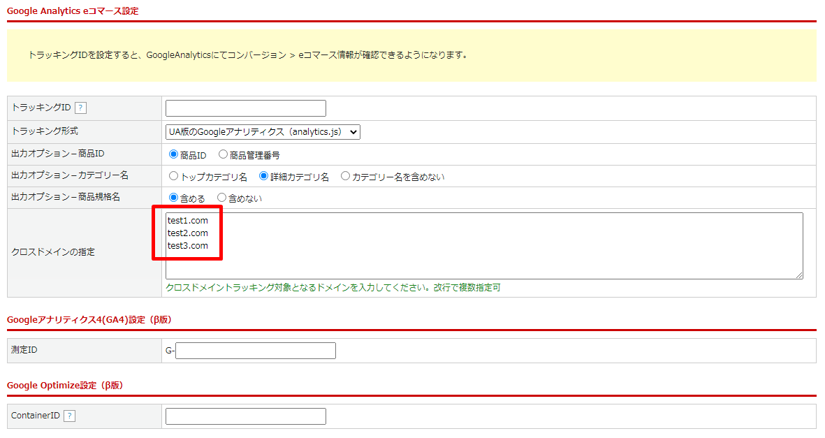 | クロスドメインの指定 | クロスドメイントラッキング対象となるドメインを設定します。 ※クロスドメイントラッキングについては<こちら> |