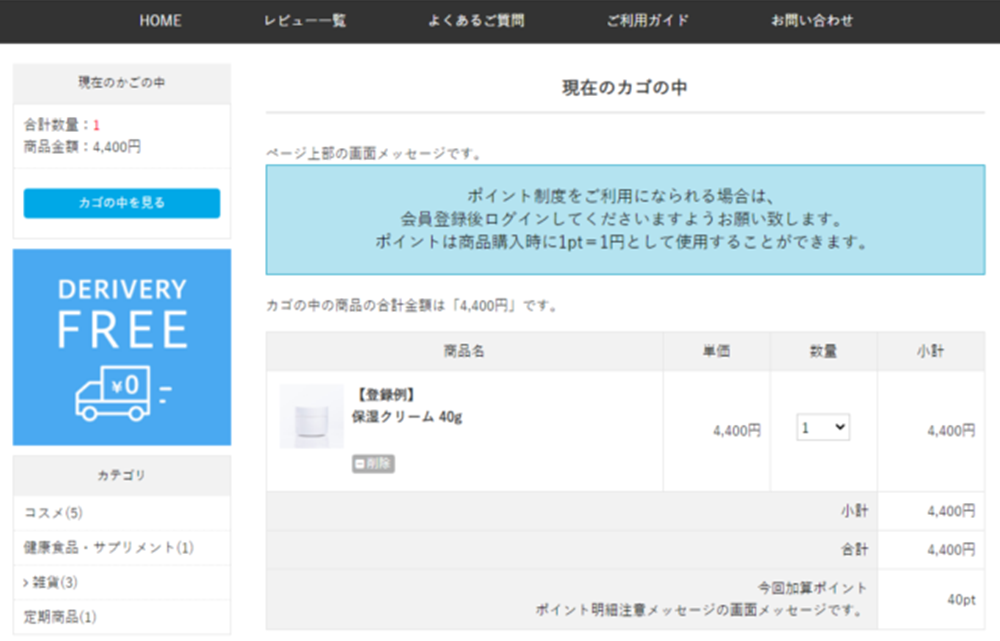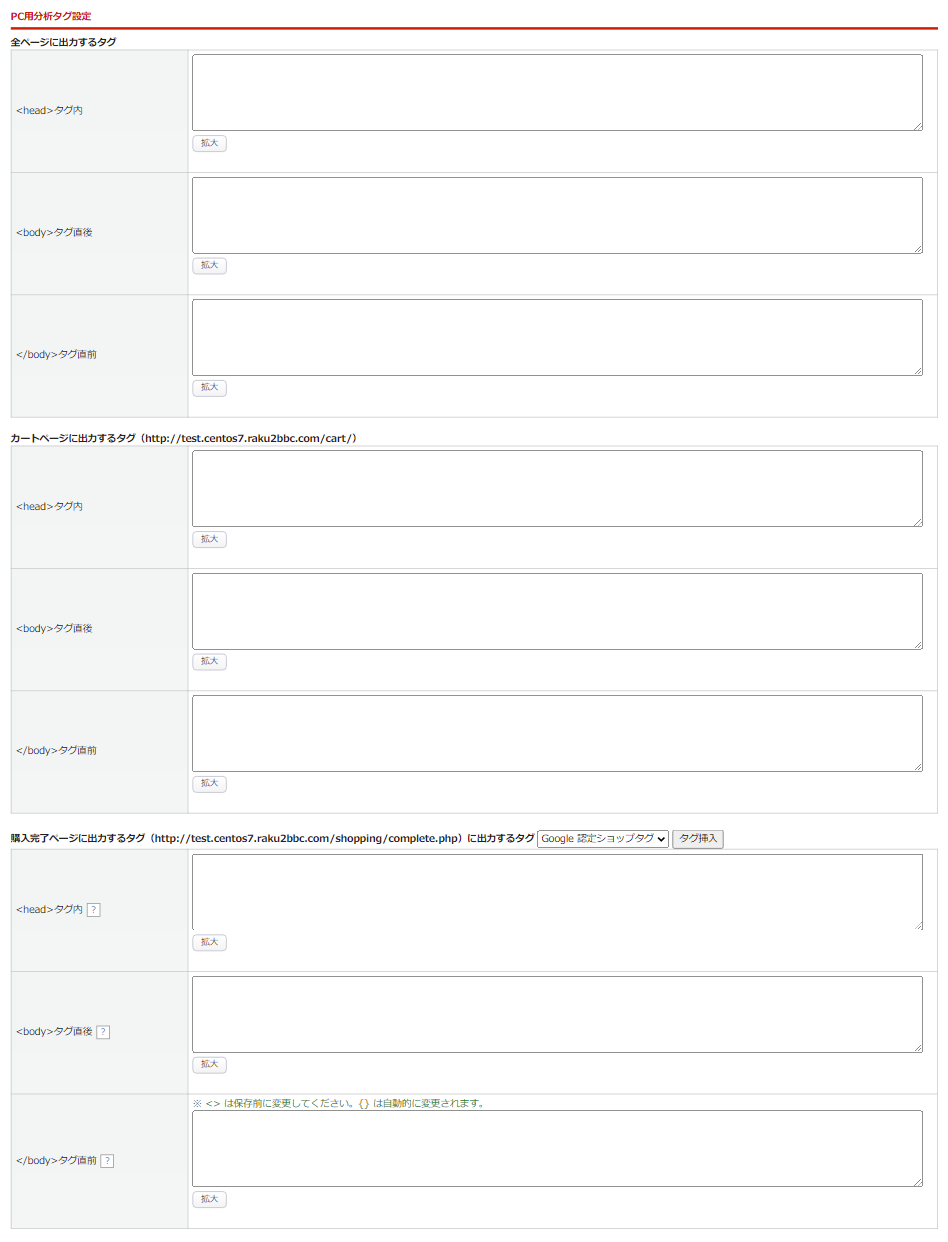 | カートページに出力するタグ | カートページに出力するタグの設定ができます。 タグの出力場所は<head>タグ内/<body>タグ直後/</body>タグ直前から選択できます。 ※カートページ(http://ドメイン/cart/) ![]() |