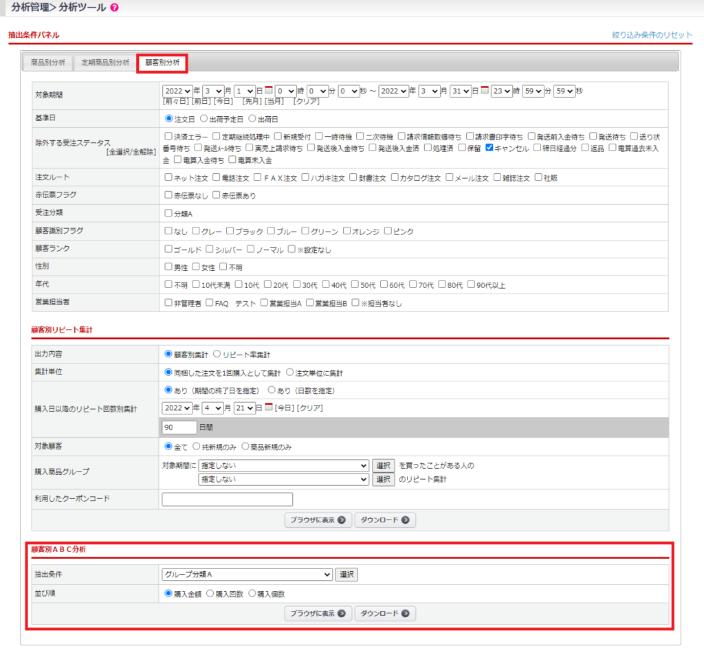 1.分析>分析ツール>[顧客別分析]タブ 顧客ABC分析 よりデータをダウンロードします。