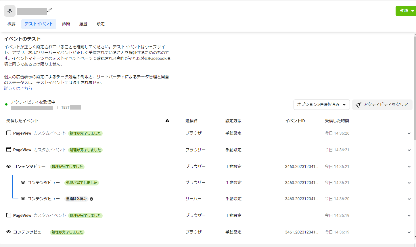 テストモードの場合、[テストイベント]タブからリアルタイムでイベントの送信状況が確認できます。