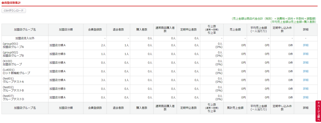 - 集計単位「サマリ」で集計後、会員登録別集計で各加盟店/加盟店グループの「詳細」をクリックする。