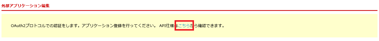 外部アプリケーション編集下部の黄色枠内に設置されている「こちら」リンクをクリックすると、「システム設定>API仕様」にて各種API仕様の確認ができます。