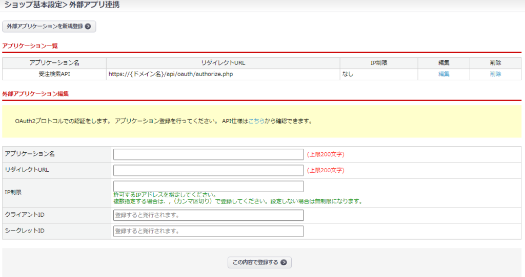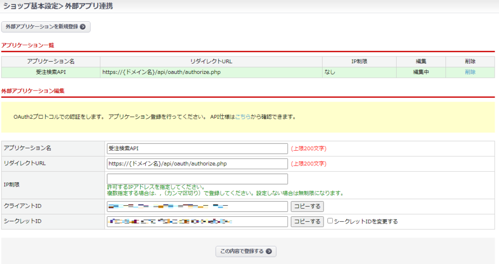 【外部アプリケーションを新規登録】ボタン、「アプリケーション一覧」の「編集」リンクをクリックし、