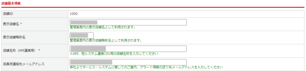 | 表示店舗名* | 管理画面内の表示店舗名 |