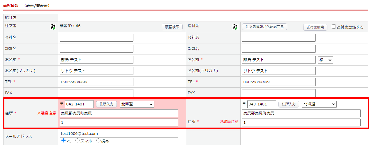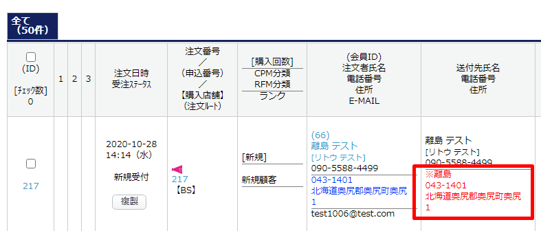・離島登録した住所が送付先に登録された際、受注一覧と受注登録画面で注意メッセージが表示されます。