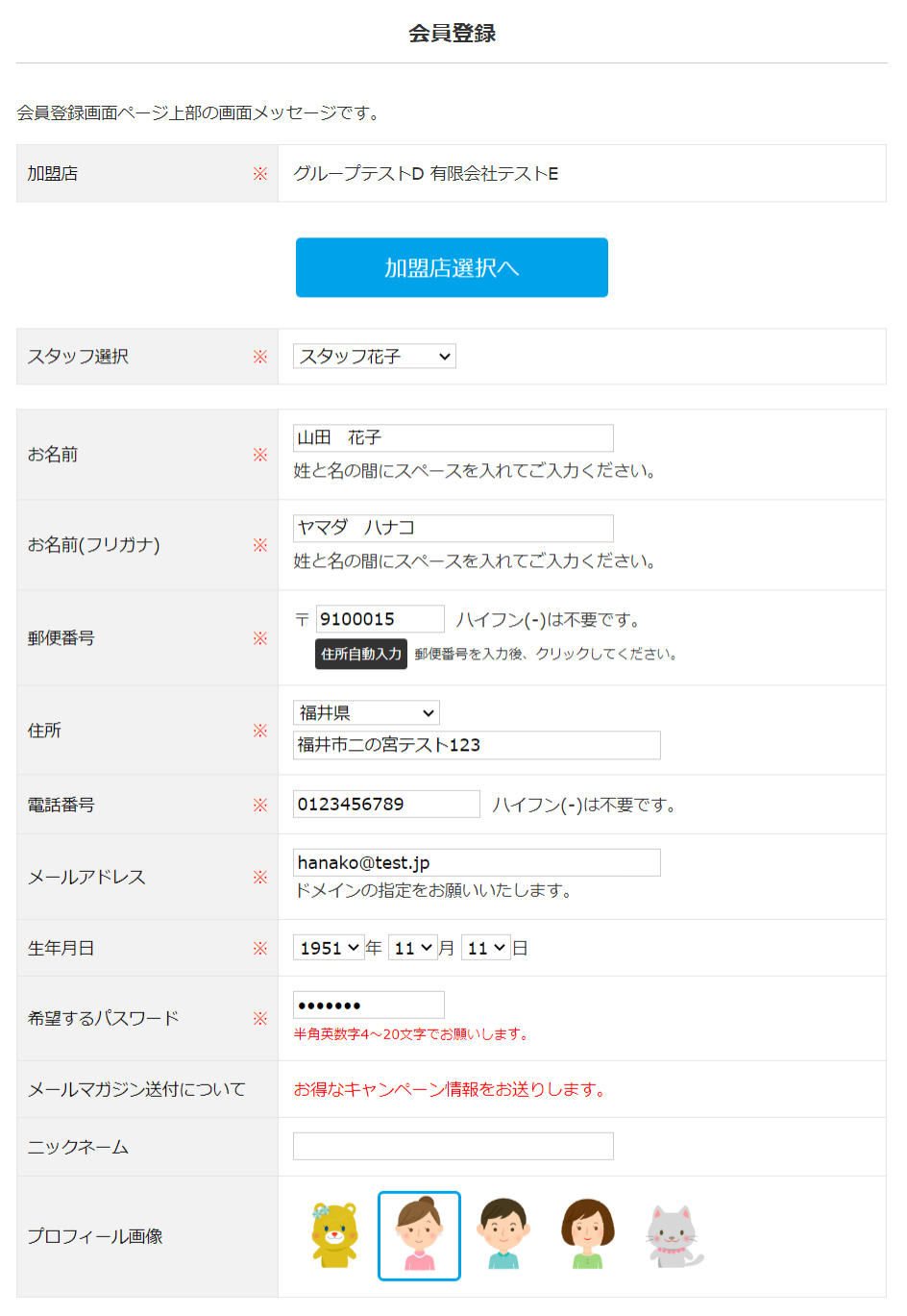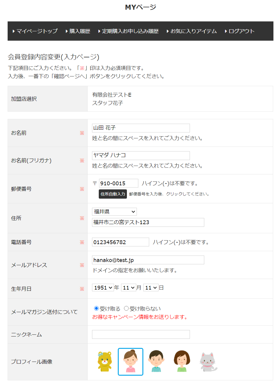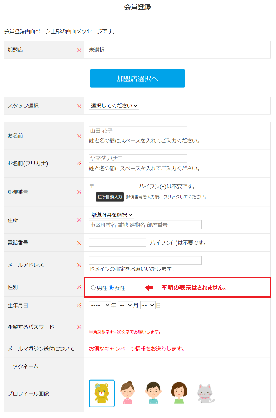 新規会員登録画面、MYページ会員登録変更画面、フォーム一体型LPの入力フォームに反映されます。