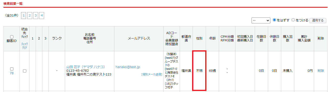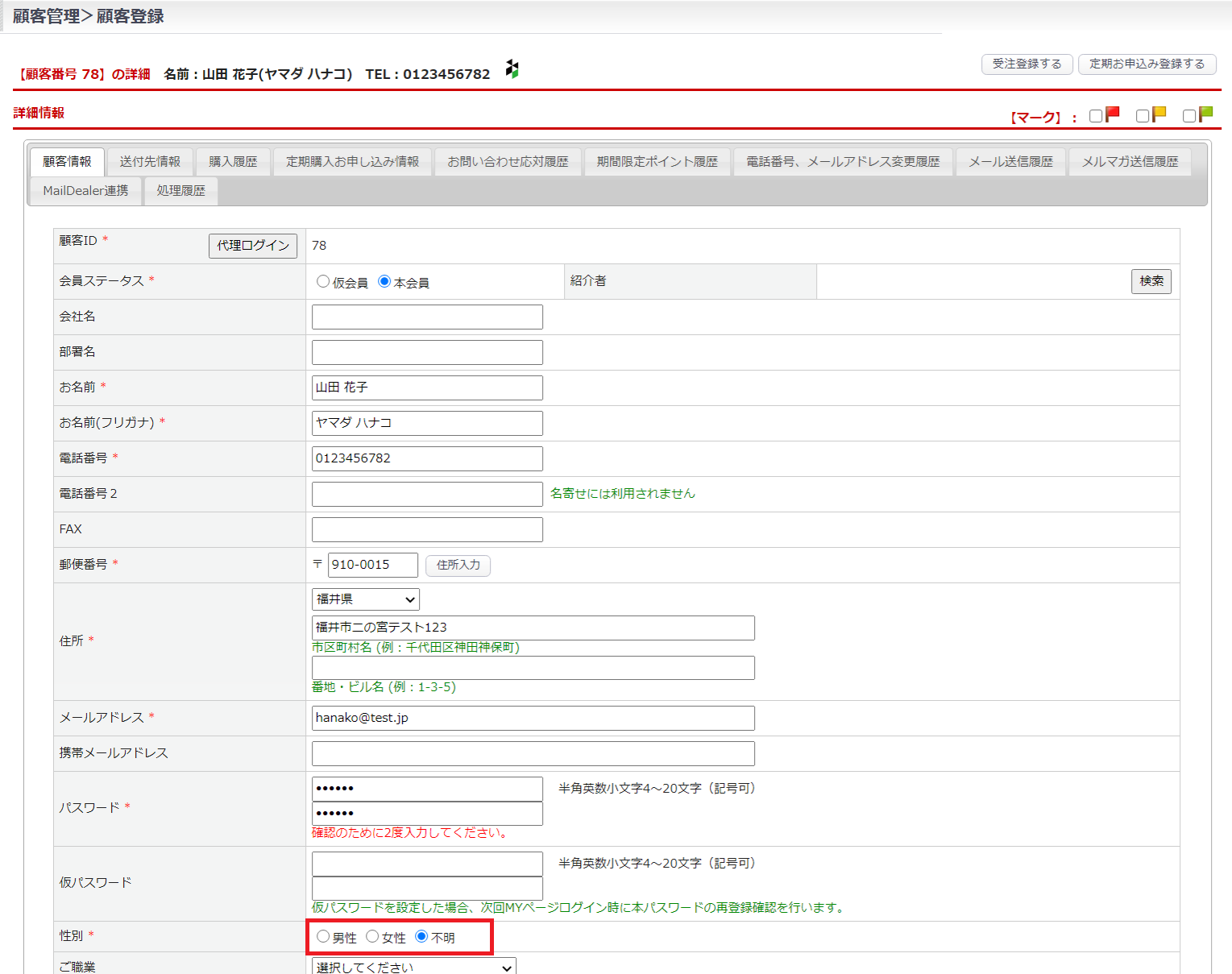 ※性別項目の表示有無を「表示する」、初期値→「不明」に設定した場合、