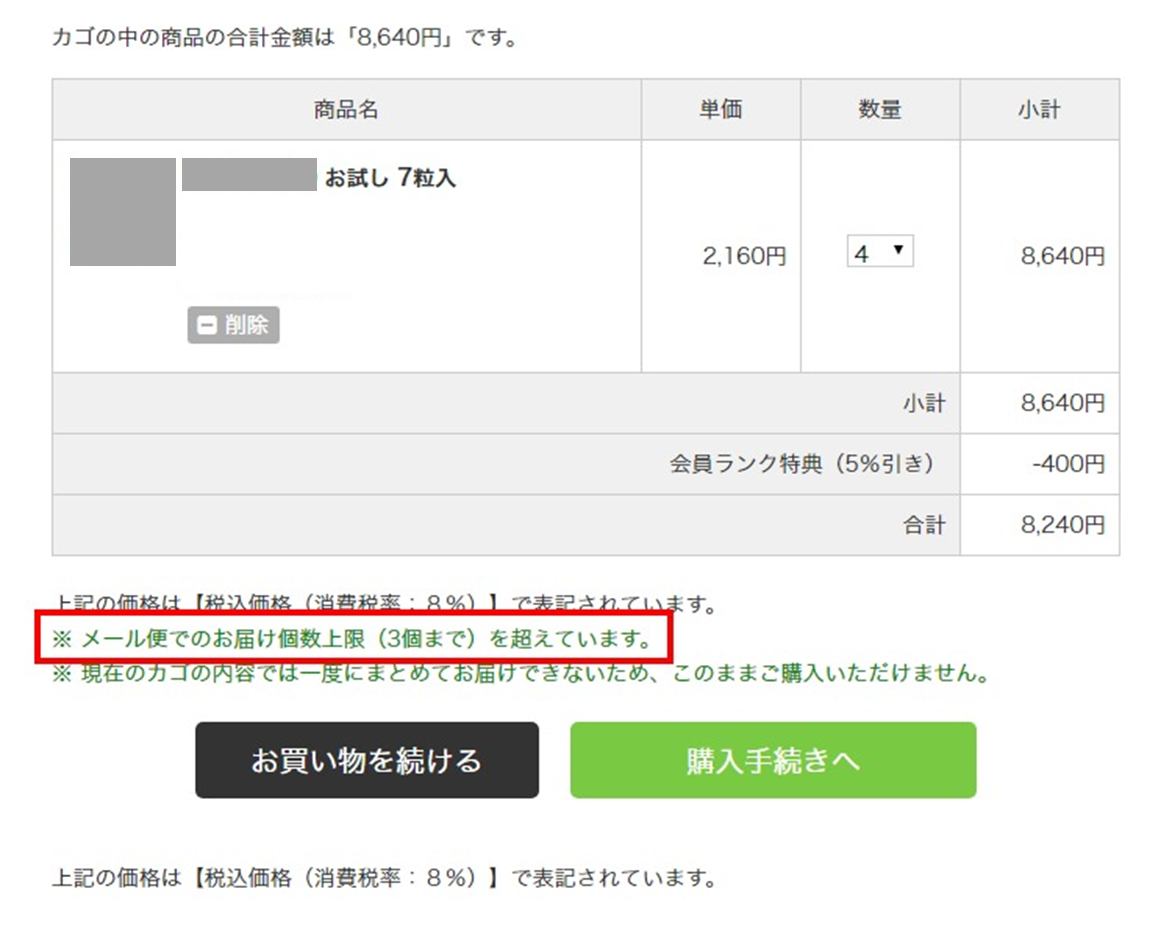 商品数が3個以上(同商品/別商品問わず)の場合以下のエラーメッセージが表示され購入不可となります。