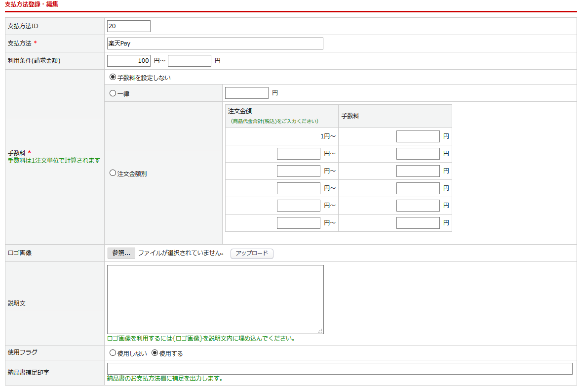 支払方法ID:20「楽天ペイ」の「編集」より遷移した編集画面にて設定して下さい。