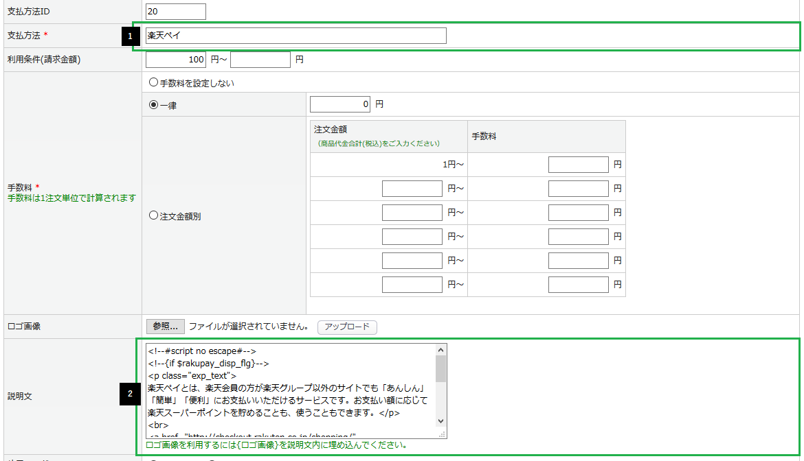 | 説明文 | 支払い方法の説明を設定したい場合は入力してください。 設定した内容はカートの支払い方法の説明として表示されます。 htmlの使用が可能です。 ロゴ画像を利用するには{ロゴ画像}を説明文内に埋め込んでください。 楽天ペイの場合、購入フローで下記の表示が必要です ・サービス名(楽天ペイ) ・サービスの紹介文 ・サービスロゴ/アクセプタンスマーク 詳細はサービスご契約時に楽天より送付される導入手順書をご確認ください |