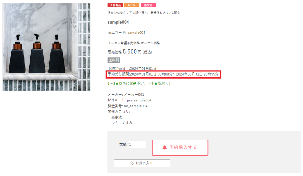 ・「予約商品発売日」の設定をすると、予約発売日が表示されます。