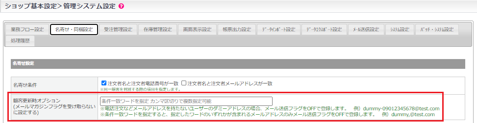 基本設定>管理システム設定>[名寄せ・同梱設定]タブ>顧客更新時オプション に