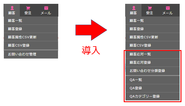 オプションを導入すると、「顧客応対一覧」~「QAカテゴリー登録」が追加されます。