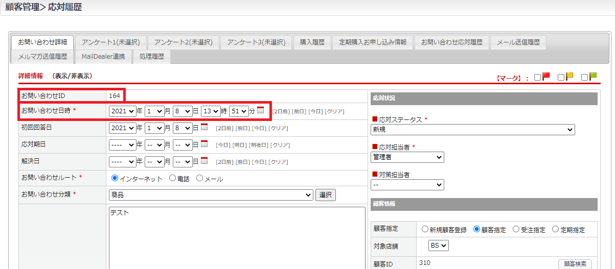 フロントのお問い合わせフォーム、または、管理画面にて応対登録を行った際に設定する、