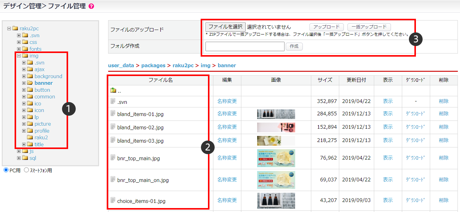 デザイン(PC/スマートフォン)>ファイル管理 よりアップロード可能です。