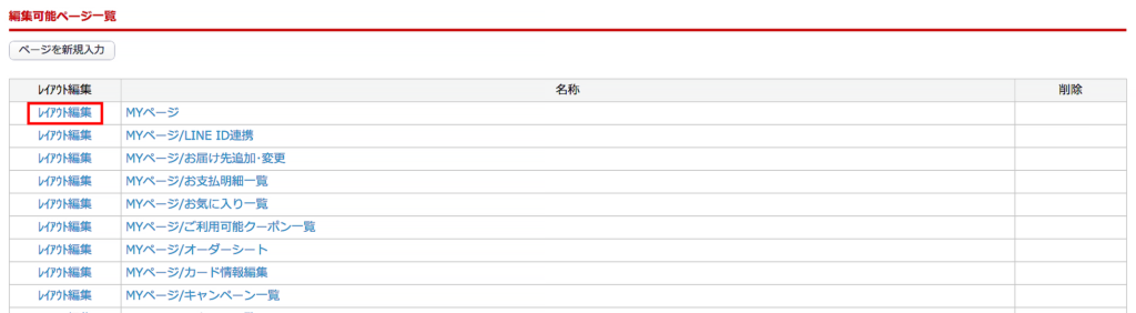 編集可能ページ一覧から各ページの「レイアウト編集」をクリックすることで編集が可能です。