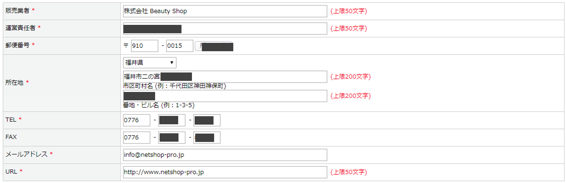 特定商取引法ページは項目の追加、削除やレイアウトの変更はできない仕様になっています。