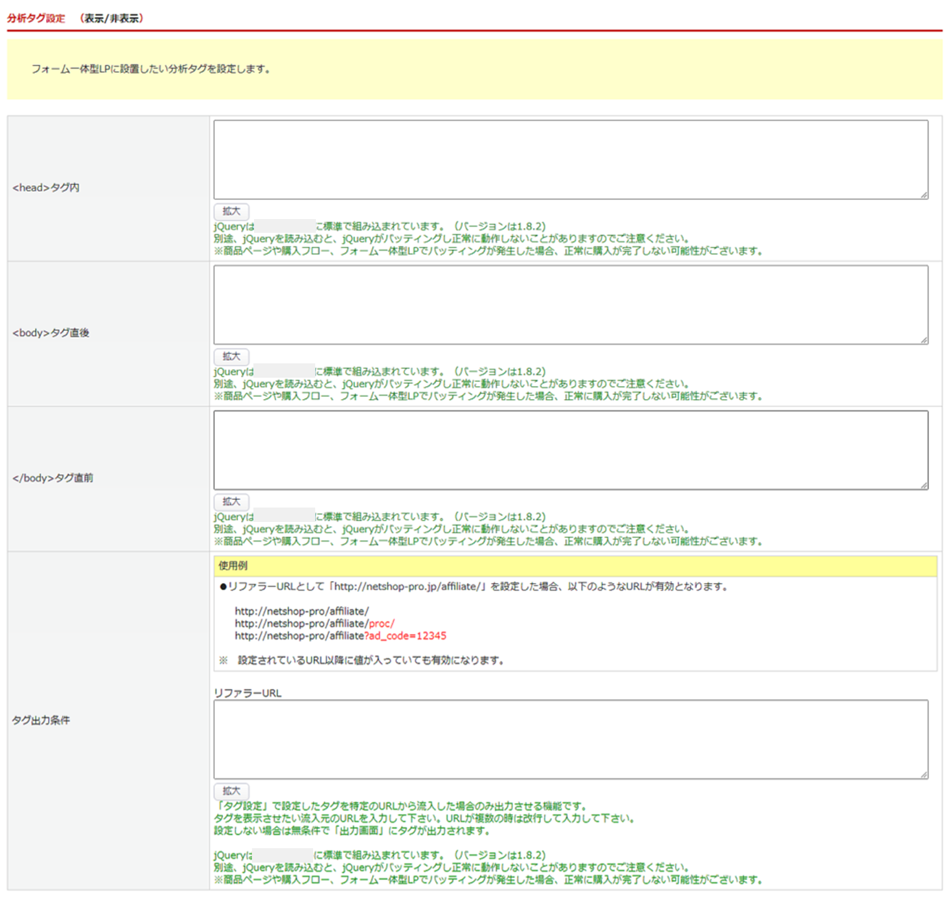 | タグ出力条件 | 特定のURLから流入した場合のみ、タグを表示させる場合に設定。 タグを表示させたいURLを記載。 |