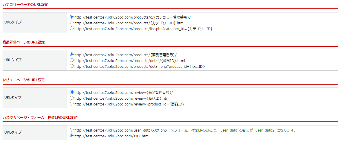 | 商品詳細ページ | 3種類から選択してください。 デフォルトは商品管理番号形式です。 |