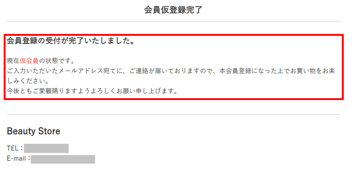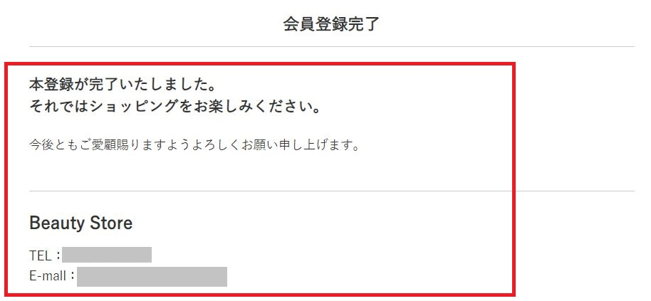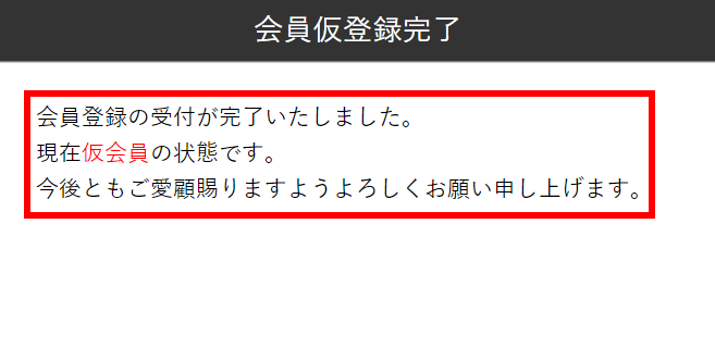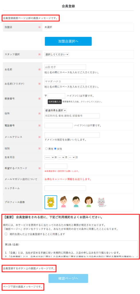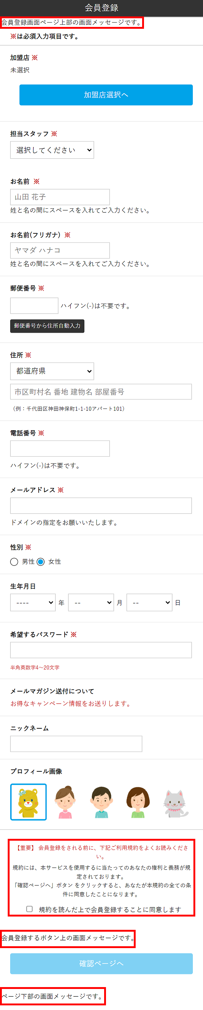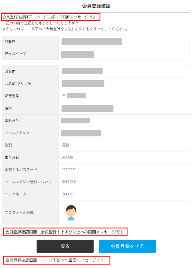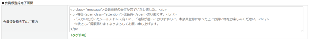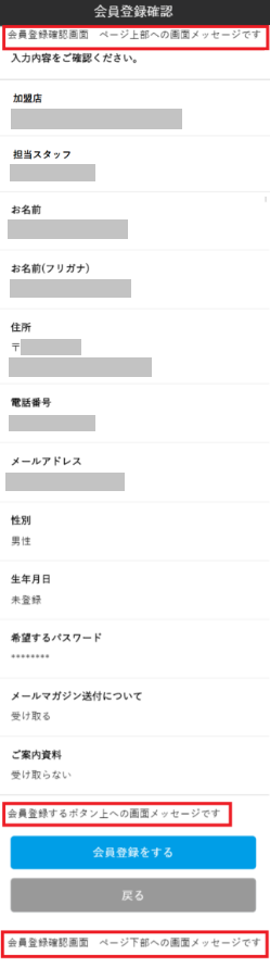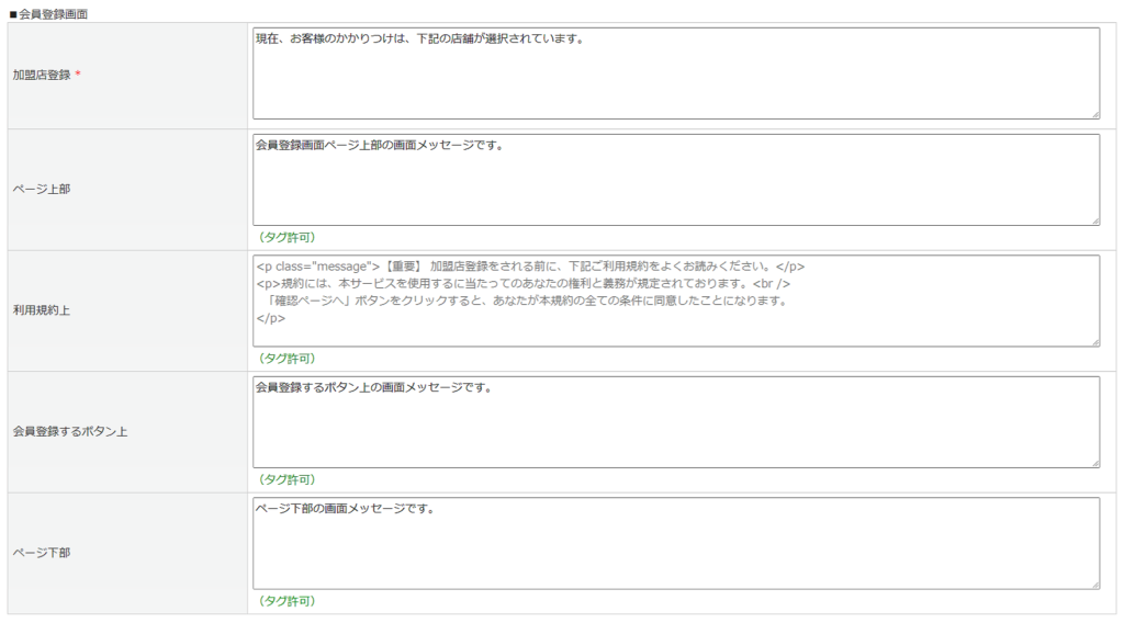 会員登録画面や会員登録完了画面内への画面メッセージ設定です。