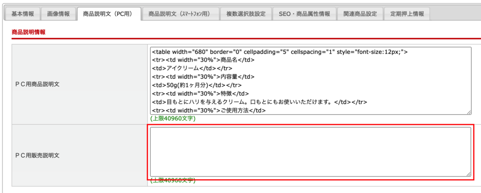 1.複製した商品の、商品説明文などHTMLを入力した箇所の一箇所を削除し登録する。