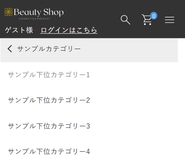 | 下位カテゴリー | 下位カテゴリーのカテゴリー名と画像が表示されます。 画像は、下位カテゴリーの出品>カテゴリー登録の「画像情報」の項目「画像」で設定した画像が表示されます。 下位カテゴリーの横幅はCSSを設定することで変更可能です。