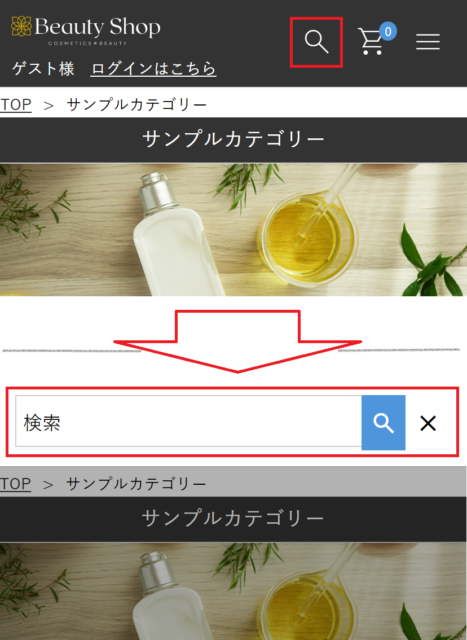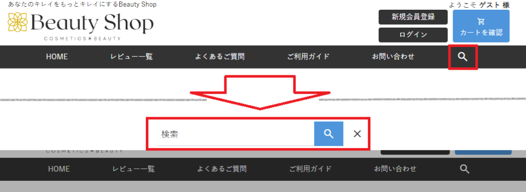 「ヘッダー検索」を設置すると、虫眼鏡ボタンが表示されます。