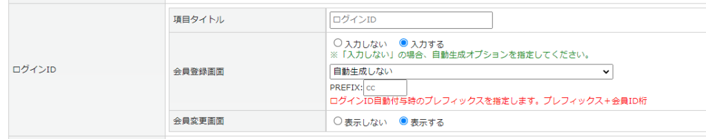顧客がログインIDを会員登録画面での入力の可・不可、ログインIDの自動付与について設定します。 顧客が任意のログインIDを設定できないようにする場合には「入力しない」、 ログインIDの自動生成について、プルダウンから選択してください。 ※「入力しない」の場合、自動生成オプションを指定してください。 |