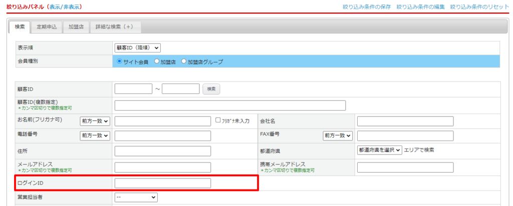 絞り込みパネル>「検索」タブ の「ログインID」にて、ログインIDでの顧客検索ができます。