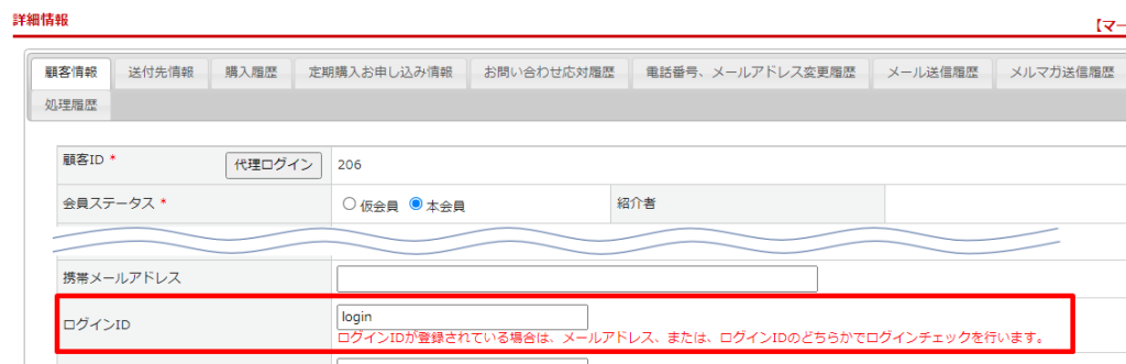 顧客>顧客登録>「顧客情報」タブ にて、ログインIDが追加されます。