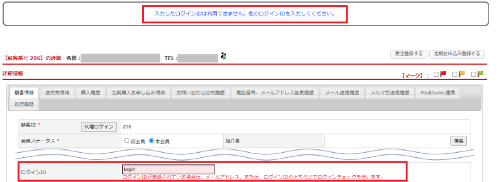 顧客編集から手動で登録したログインIDが、その後自動付与されるログインIDと重複する場合、ランダムな文字列を付与します。(PREFIX+会員+ランダム文字列)