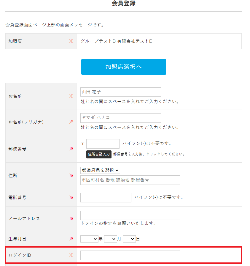 会員登録画面「入力する」の場合に、ログインIDの項目が表示されます。