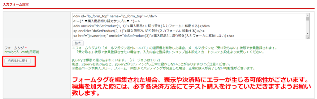 デザインPC/SP>フォーム一体型LP設定 の各編集ページにて、フォームタグを初期化してください。