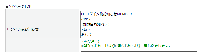 ※ {加盟店のお知らせ}の差込タグを設定すると、