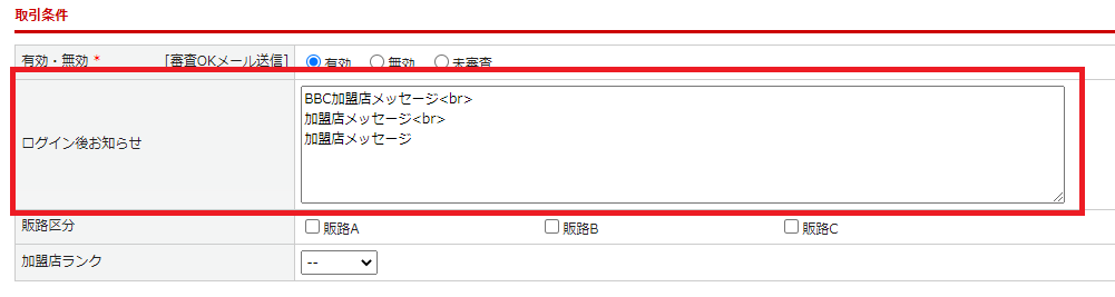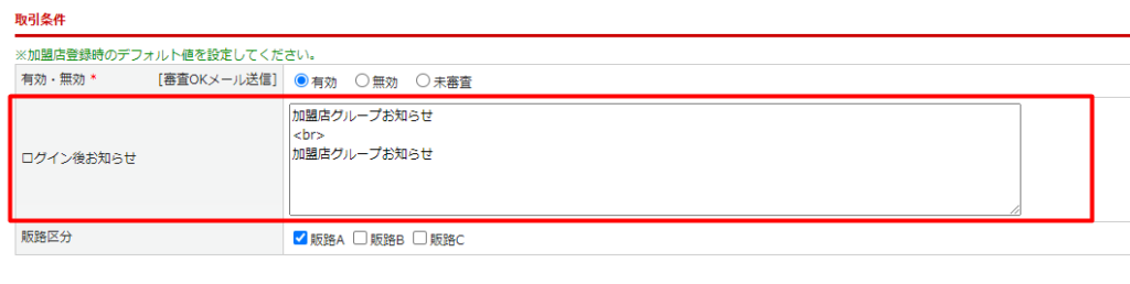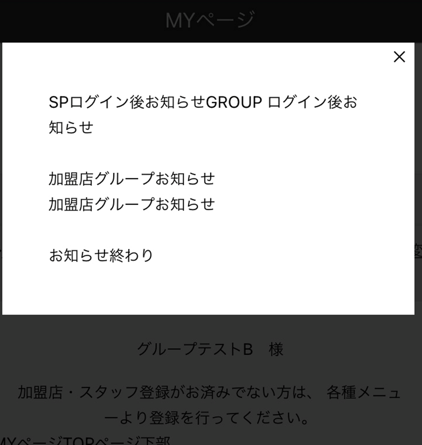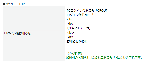 会員種別「加盟店グループ」のアカウントが加盟店グループMYページにログインした際のお知らせ内容を設定します。