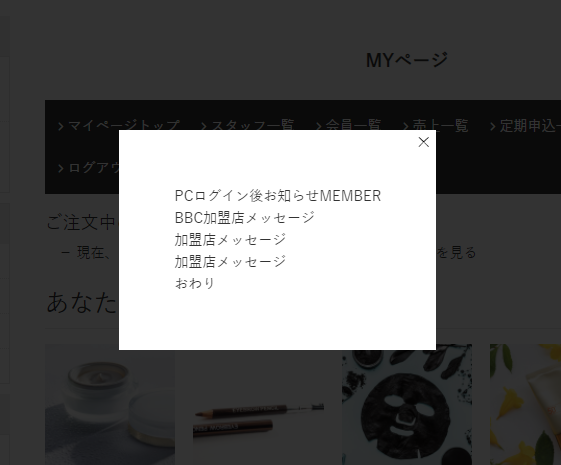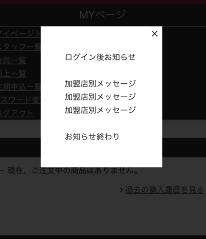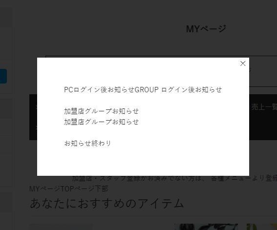 MYページログイン後のお知らせの表示を設定することが可能です。