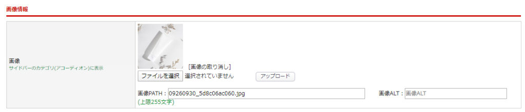 「ファイルを選択」ボタンから選択後、アップロードボタンクリック - 既にアップロードされている画像を使用する場合