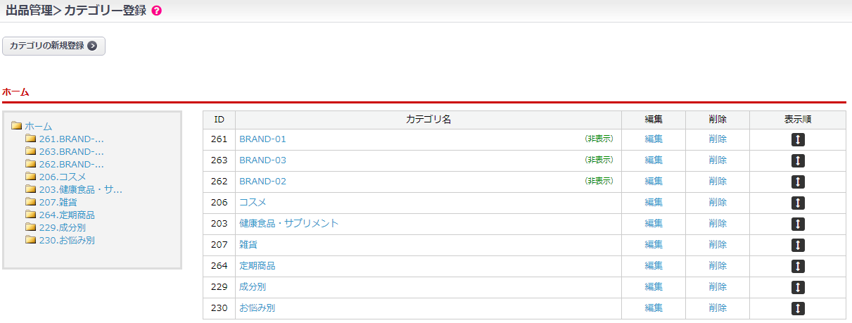※カテゴリの登録・削除は出品>出品登録画面からも可能です。商品にカテゴリを追加・削除した場合には、商品リストに商品が追加・削除されます。商品リストからカテゴリに商品を追加・削除した場合も同様です。