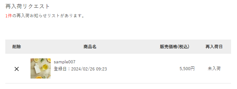 - 商品ページから【再入荷のお知らせ】ボタンをクリックすると「再入荷リクエスト」が登録されます。