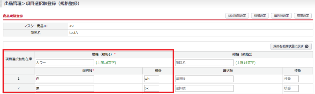 ※規格を登録した時点で、在庫設定画面を確認しても規格情報は更新されません。