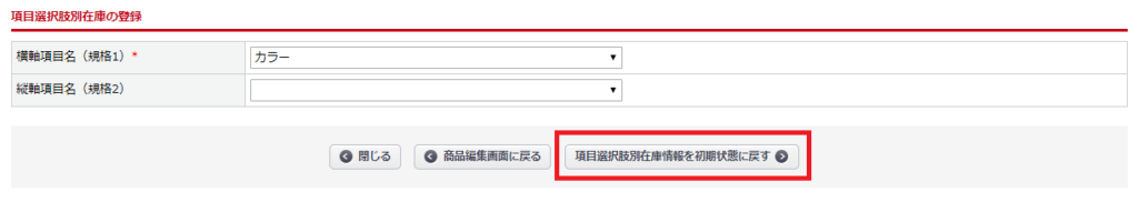 2. 在庫設定画面>項目選択肢別在庫情報を初期状態に戻す を押下