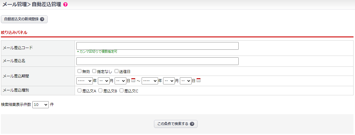 | 条件詳細 | 自動差込登録時に設定したメール差込条件の詳細 |